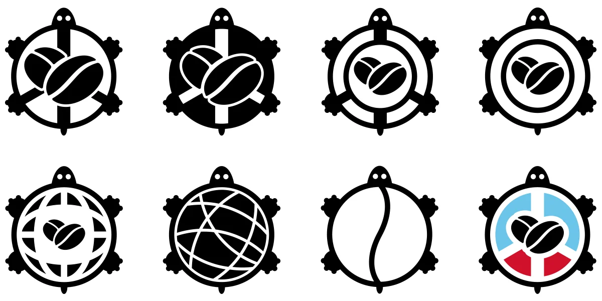 In our search for common ground, we explored several ways to reimagine both identities – independently and in tandem. In the process of creating the 20th anniversary logo, we also developed an alternate turtle graphic that replaced the 'Peace Coffee' text with a pictogram treatment.