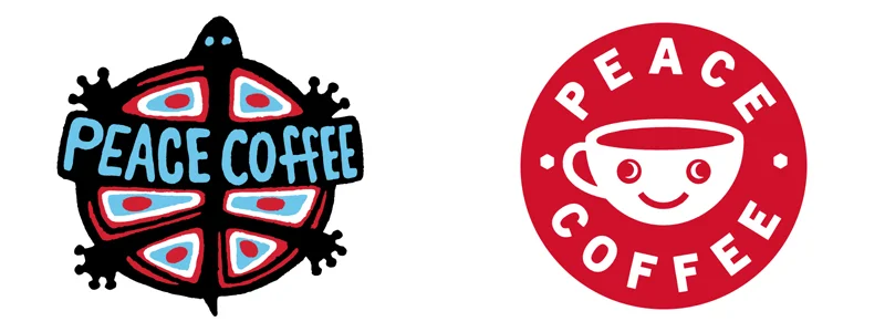 Peace Coffee has two relatively distinct identities – one for their CPG coffees and one for their coffee shops. The former is represented by a distressed turtle logo, while the latter is represented by a stylistically clean smiley-face mug.