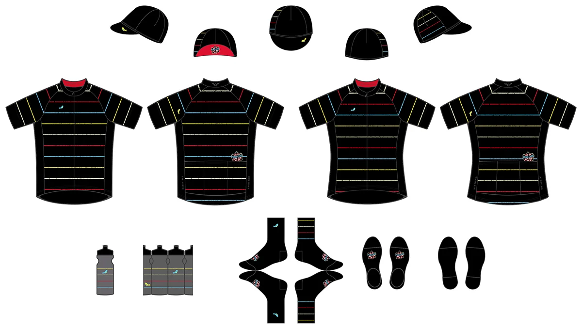 The final design incorporates Peace Coffee colors and graphics in a simple, elegant way. Thin, horizontal stripes are set far apart on a field of black. The stripe colors are taken from the Peace Coffee logo, which is tucked into the back right pocket while yellow and blue birds provide key accents on the sleeve and chest. We also designed caps, bottles, socks, and custom coffee packaging to complete the ensemble.
